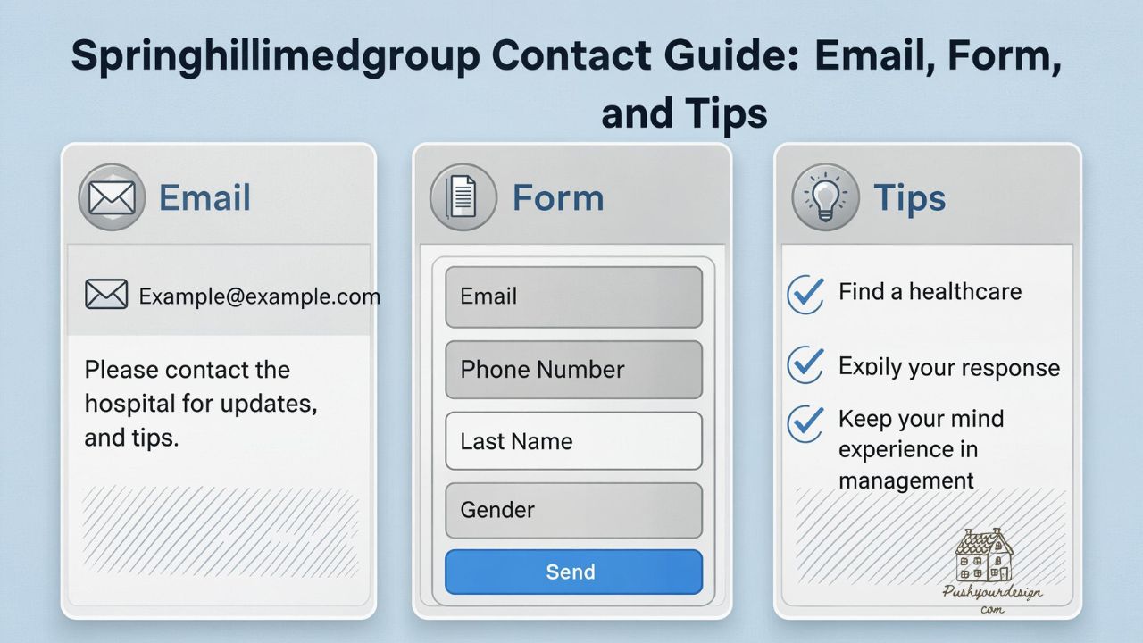 Image suggestion: Clean infographic titled “How to Contact Springhillmedgroup” with three blocks: email, contact form, and message checklist.